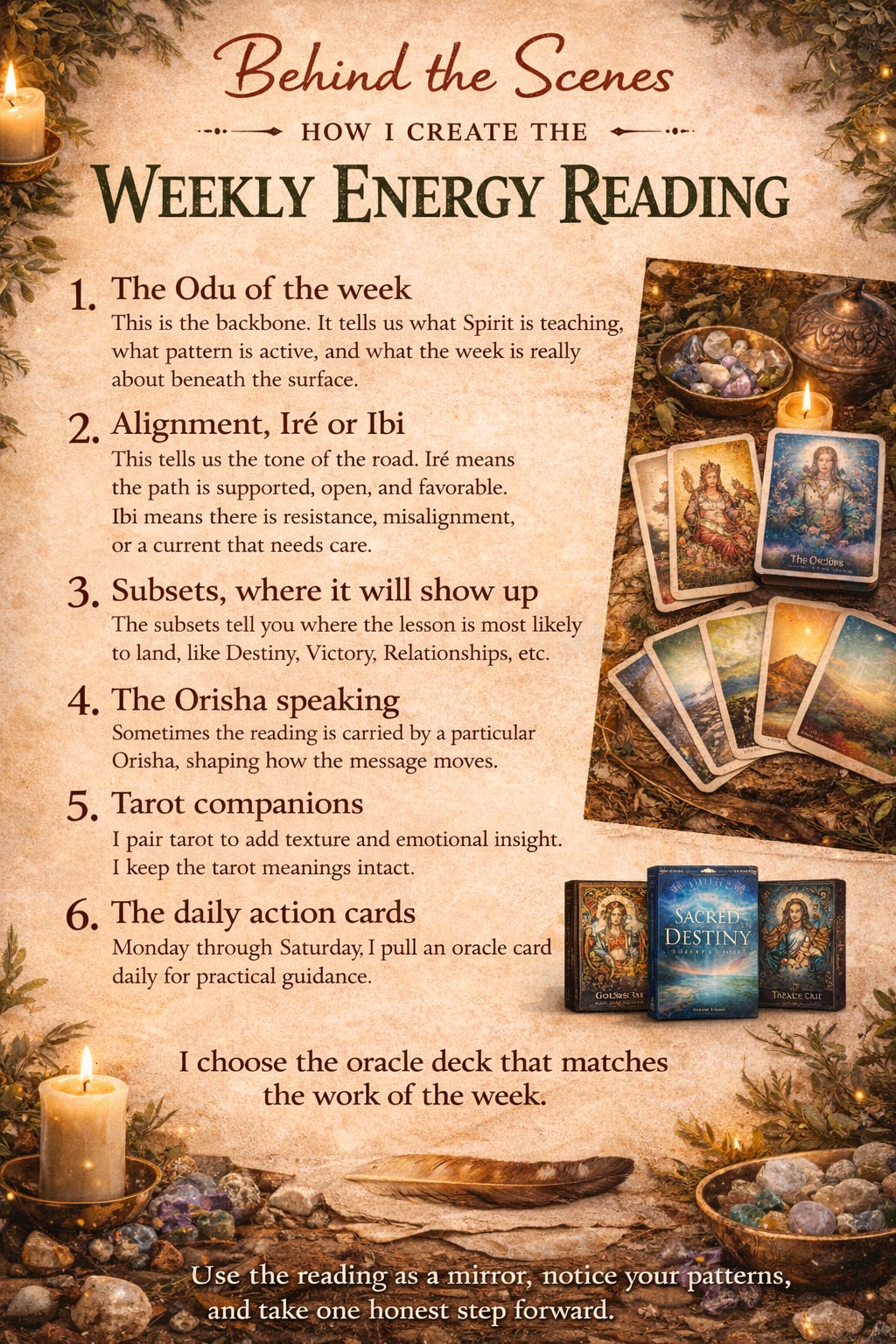 Ifá is a West African divination and wisdom tradition rooted in Yoruba culture. It holds a vast body of teachings called Odu. Each Odu carries stories, proverbs, warnings, and remedies. When I say an Odu is “speaking,” I mean that specific current of wisdom is shaping the message for the week.