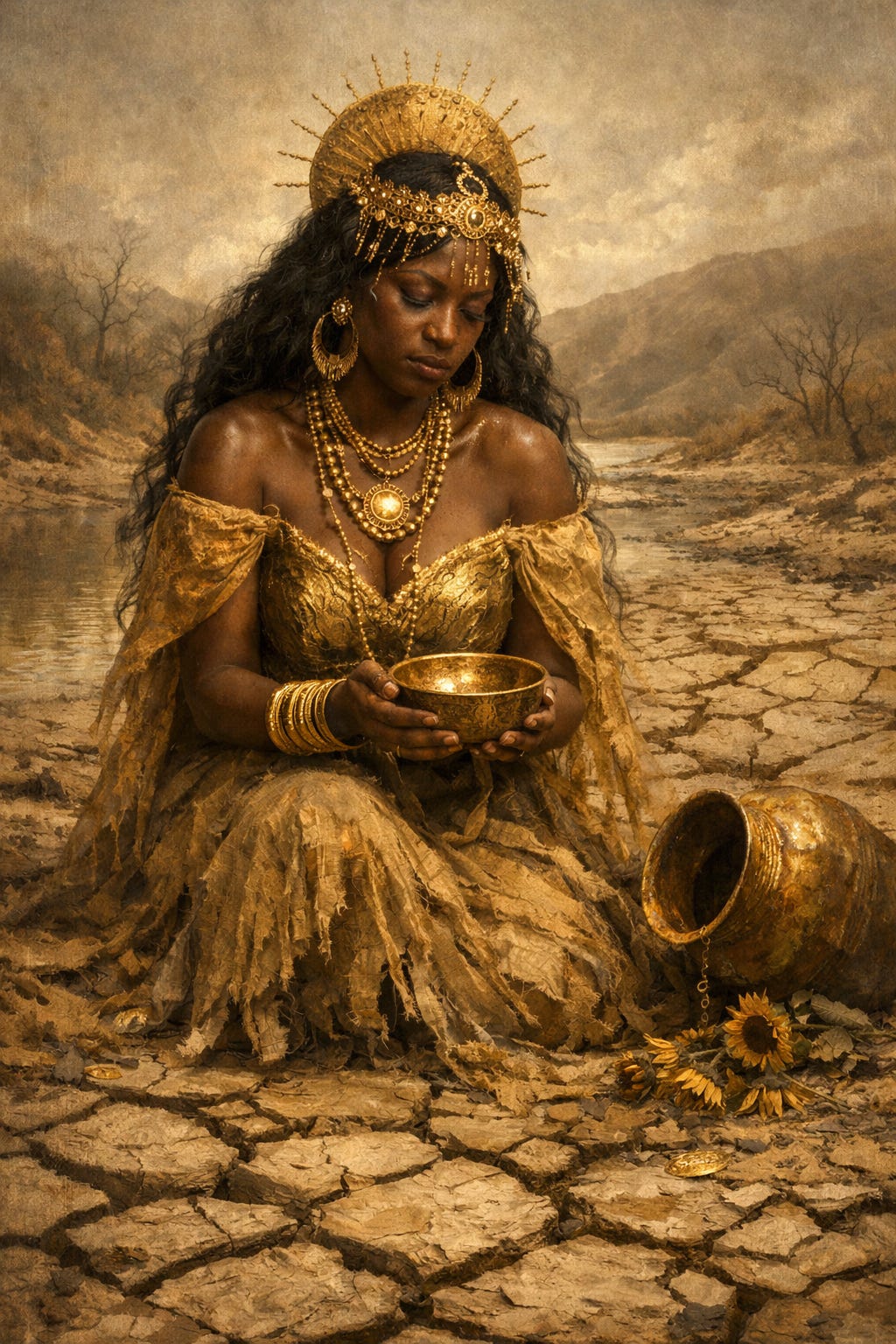 Oshun of the Drought is about dignity when sweetness is not flowing. She withholds adornment so you can see your bare face clearly. She reduces excess so your worth is not confused with attention.